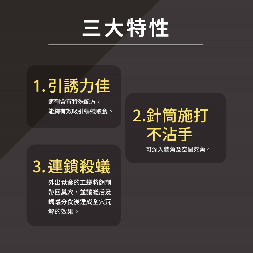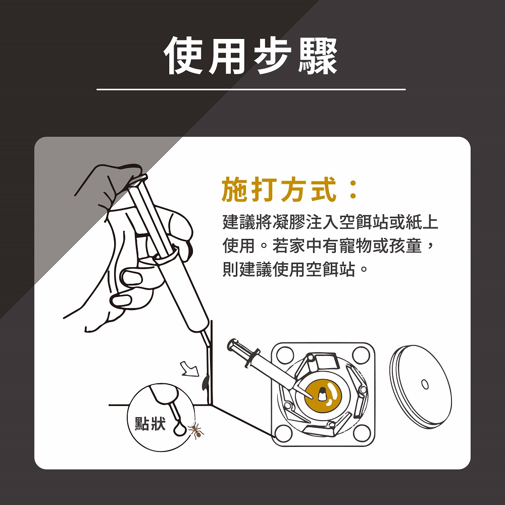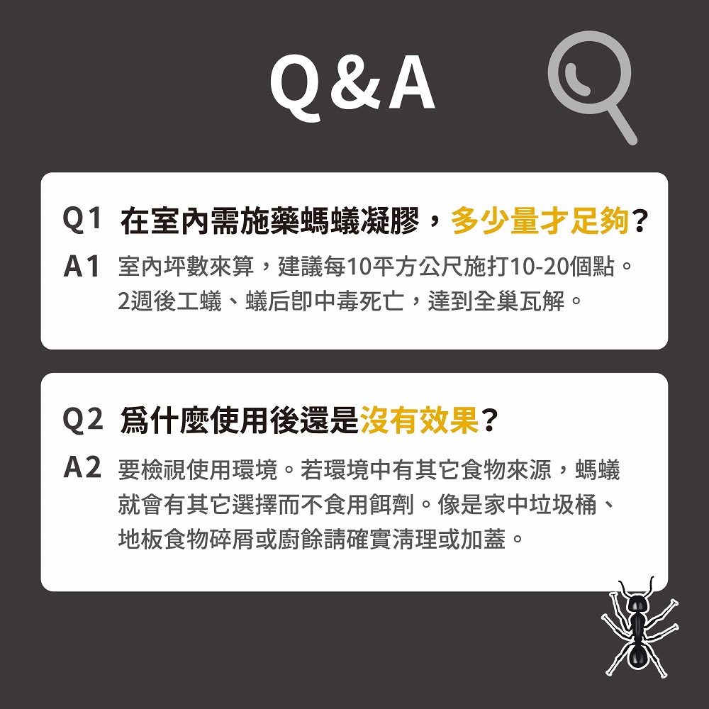 2. 本品為緩效性餌劑,施用約兩週後逐漸看不到螞蟻出沒。